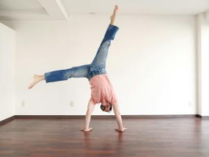 ブリッジの体勢から足を離して倒立・立ち上がる際、手根で床を押すと肩と腕でマットが押しやすくなるので、勢いのまま綺麗な着地ができます。