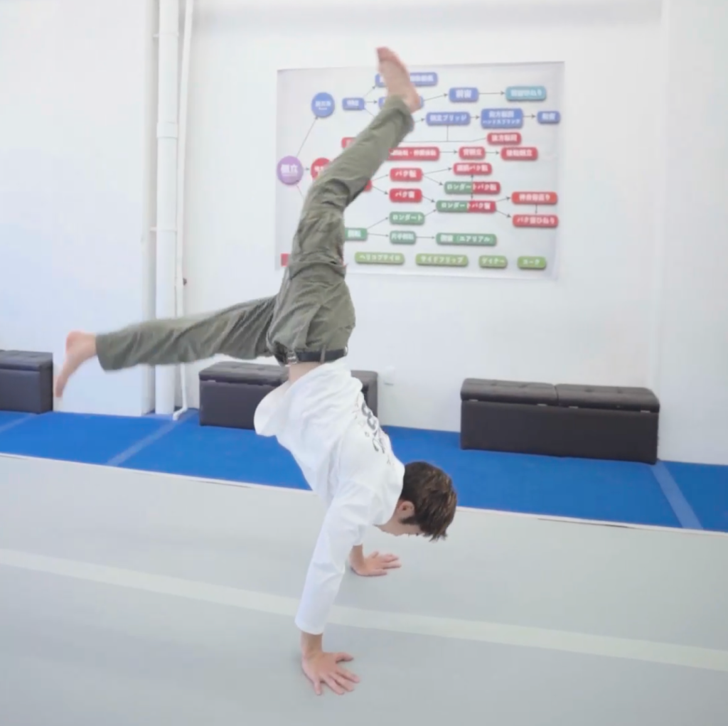 その際、壁倒立で片足ずつ振り上げる練習から始めましょう。壁倒立は、回転系の技を習得するための基礎でもあるので、他のアクロバット技にも活かせます。