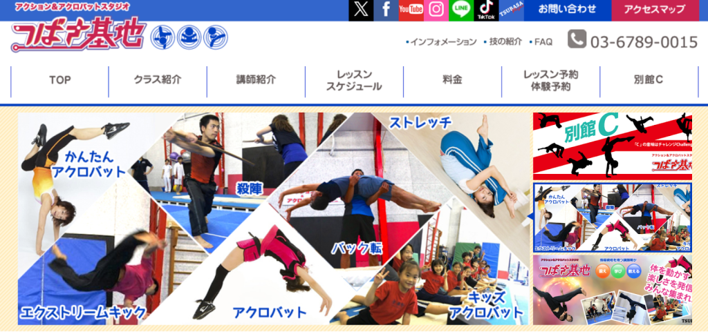 つばさ基地は、2006年に設立され、歴史あるアクロバット教室として運営しています。基本的には、グループレッスンで指導しており、多様なプログラムから選択できるのが特徴です。